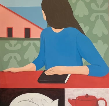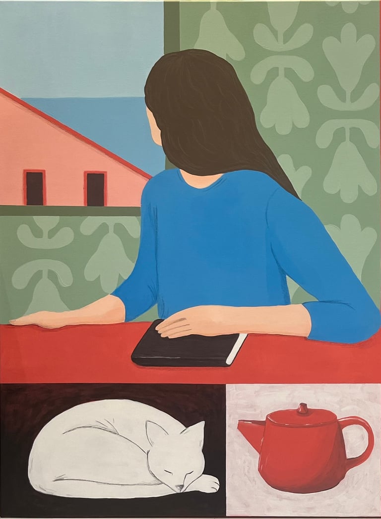 The fragmented composition of the canvas brings together symbols of quietude and ritualistic domesticity. But there is a symbolic element of strategic thinking that coexists with comfort, suggesting that Koselig is more than a passive state: it is an actively chosen existential position, constructed and defended against external noise.